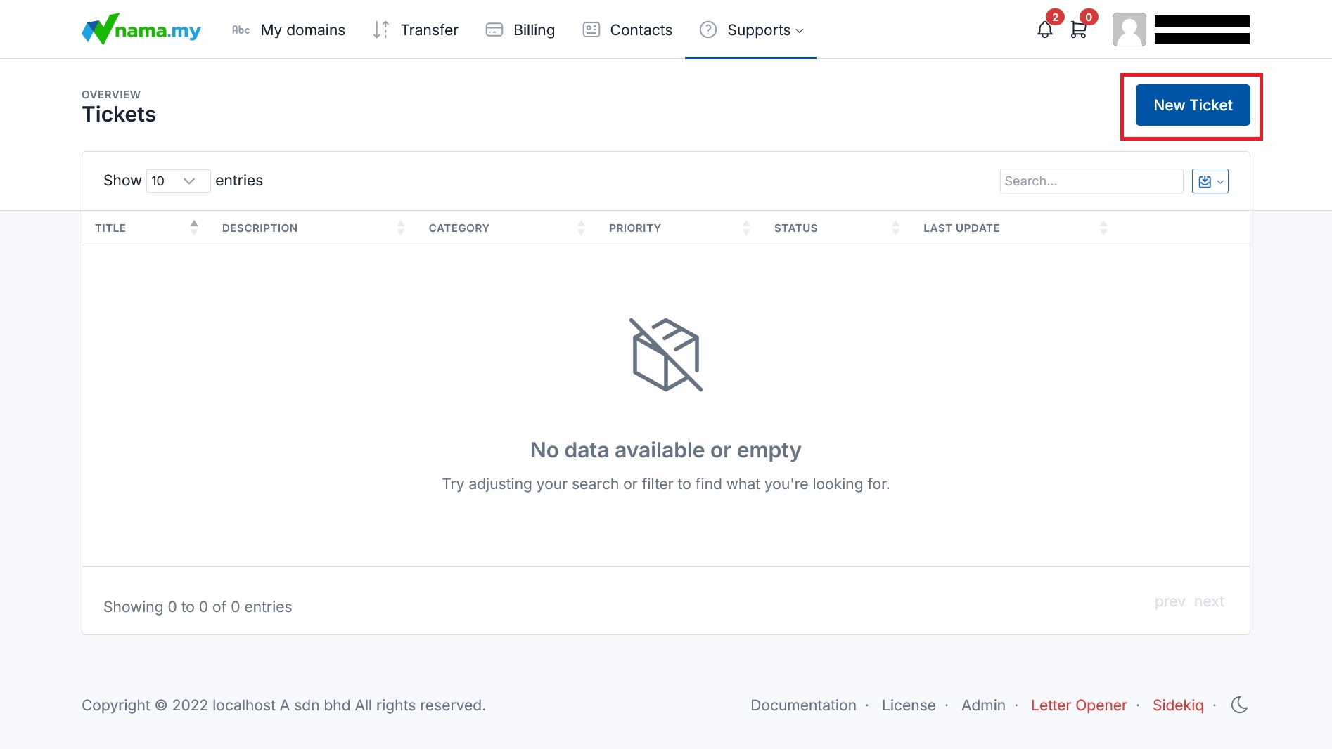 New Ticket: Click the "New Ticket" button in the top right corner in "Supports" tab.