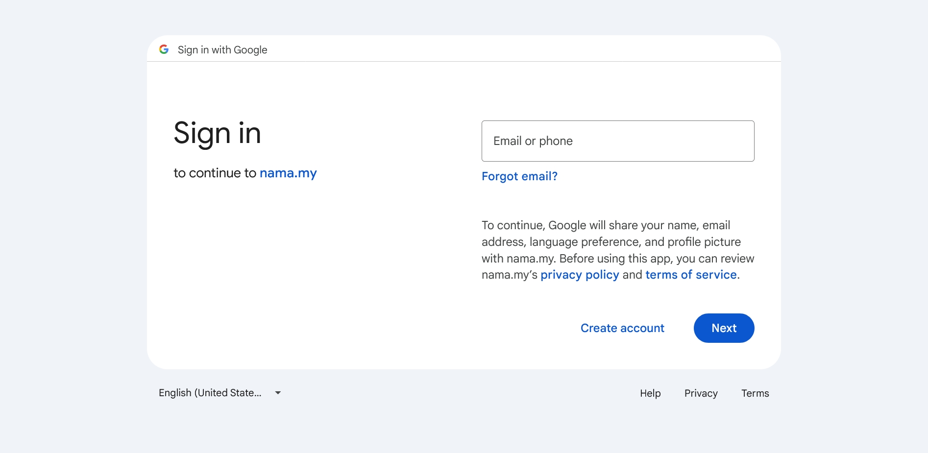 Sign in into Google: Enter your Google account credentials and sign in into your Google account to continue to nama.my.